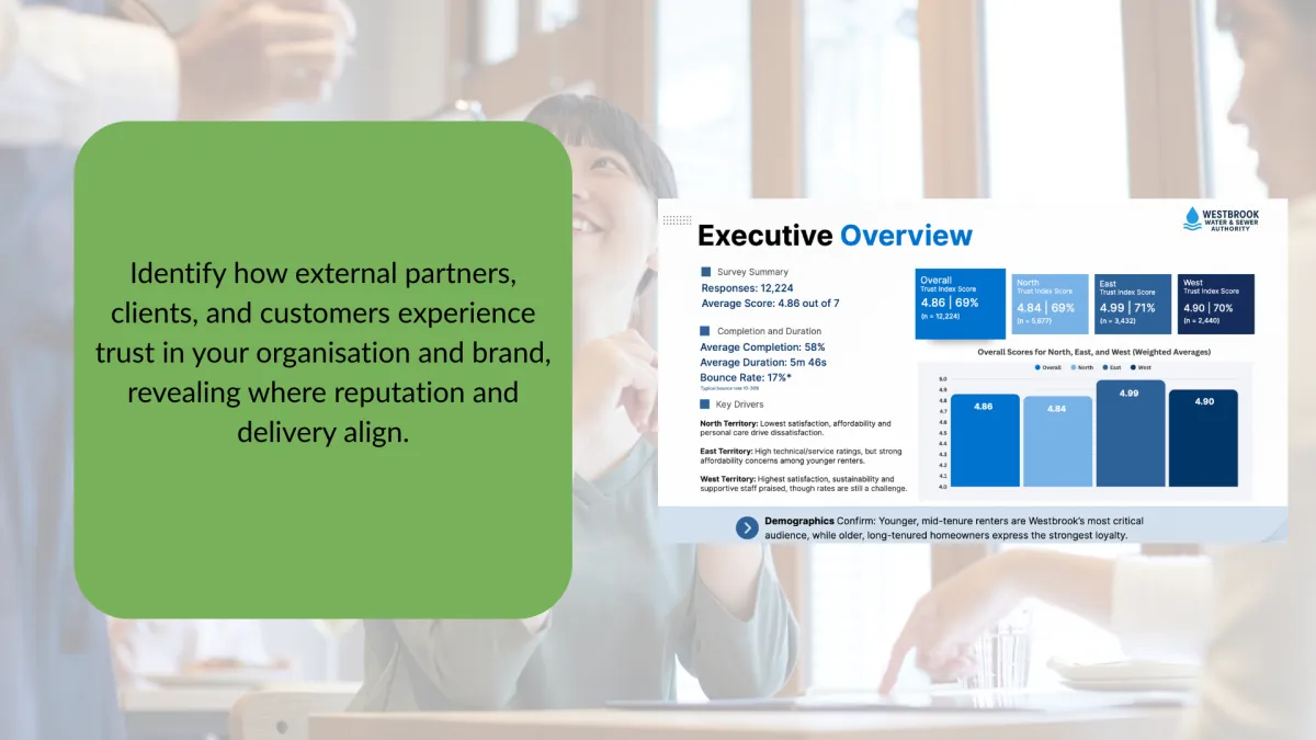 It shows where trust is built, where it is fragile, and how it shapes engagement, decision-making and collaboration.